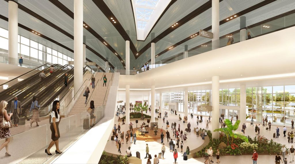 The new airport terminal spans 972,000ft2 (90,300m2) and features three concourses, 35 gates, two new parking garages for short-term and long-term parking, a surface parking lot, and an economy garage with shuttle service. Concessions, located past security checkpoints, will feature more than 40 food, beverage, news, gift and specialty retail options.