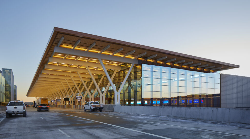 The redevelopment has replaced the existing, overcrowded terminals – originally opened in 1972 – with a single, sustainable building. The building consolidates all airline operations under one roof, with a 6,000-space parking garage just steps away, to improve the passenger experience for arrivals and departures alike. The building’s 39 gates will be used for domestic and international travel, and its layout enables the facility to expand by another 11 gates in the future.