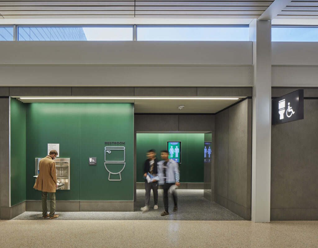 The development partners used a series of community meetings to engage with residents of Kansas City and its surrounding areas to determine how to create a terminal that would be comfortable, convenient and welcoming to all. The city issued a resolution calling for the terminal to be “the most accessible in the world”, a goal that became a guiding principle for the design. Every gate desk, check-in position and information desk is set to a wheelchair-accessible height. The Kansas City Air Travel Experience simulator gives passengers who are unfamiliar or uncomfortable with air travel the chance to test run the space in the days before a trip, and a quiet room offers a refuge for all travelers in need of a calming space. With gender-neutral restrooms, a sensory room for children, and more, the new terminal will make the travel experience welcome to all segments of the public.