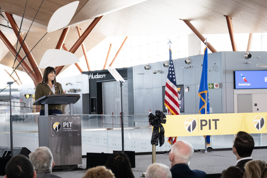 Pittsburgh Airport CEO Christina Cassotis delivering her speech at the ceremony. Credit: Pittsburgh International Airport