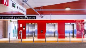 The Terminal 1 Parking Plaza has been designed with three sections, or cores that each have a unique color and graphic scheme to help customers with wayfinding and includes glass-backed elevators and an open stairwell to help promote safety and security. The cores align with the facility’s open lightwells, which help provide natural light and ventilation.