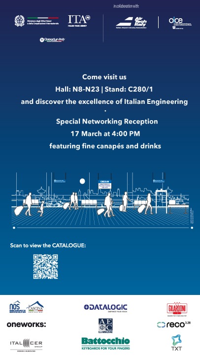 The Italian delegation will be located in Hall N8–N23 at stand C280/1, with partner companies also present throughout the exhibition. Visitors are invited to meet the delegation to obtain an overview of the participating companies and their integrated airport solutions.