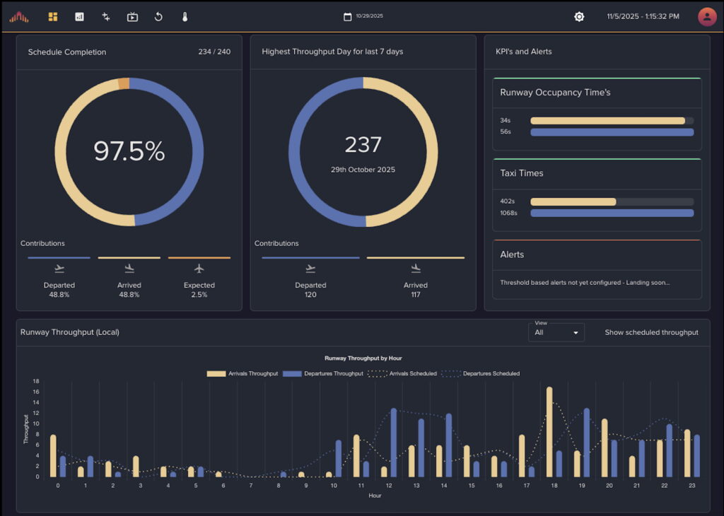Searidge Technologies will present Airfield Insights, a data and analytics platform built on a purpose-built digital twin, designed to translate airfield activity into operational KPIs. The platform aims to help airports identify constraints, understand performance trends and improve resource allocation by turning airfield movements and events into actionable insight for operations and planning teams.