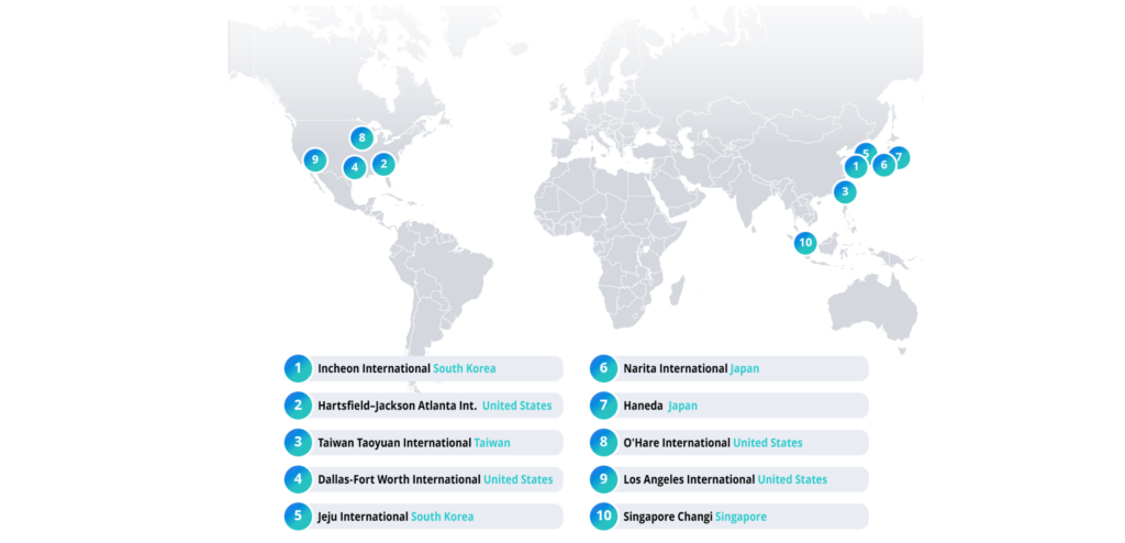 Incheon International Airport in Seoul, South Korea was found to be the world’s best airport for food, with 270 options to choose from and a typical main menu or lunch item costing an average of US$8.18.