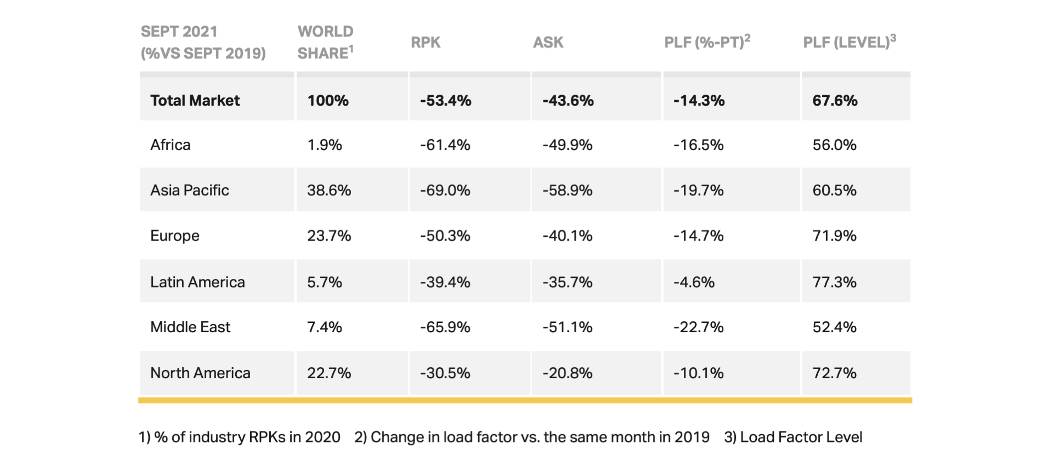 Internationally, there was a range of demand changes in the passenger markets. For European carriers, international traffic in September saw a 56.9% decline from the same month in 2019. This was a 1% smaller decline than August, which saw a 56.9% reduction compared with the same month in 2019. Capacity also dropped 46.3% and load factor fell 17.2% to 69.6%.