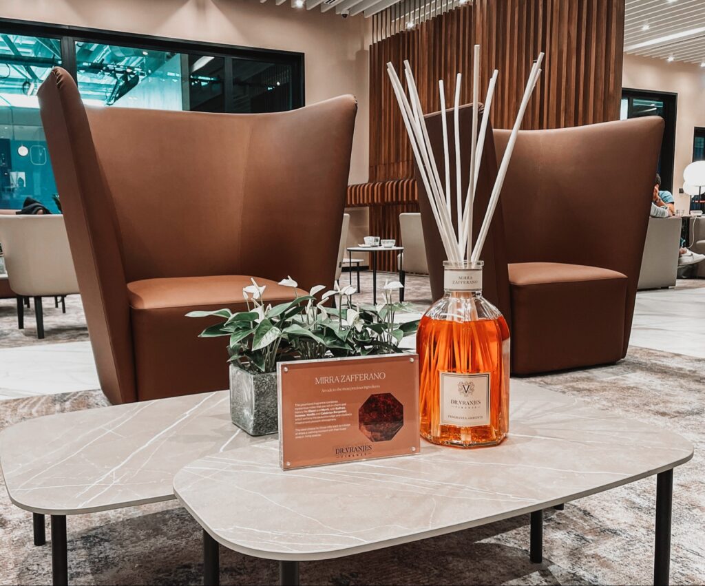 Guests can enjoy the home fragrance diffusers of Dr Vranjes Firenze, an Italian fragrance brand that originated in Florence. This collaboration with a luxury fragrance brand is intended to add a distinct sensory experience to the lounge, creating an immersive atmosphere of relaxation and indulgence.
