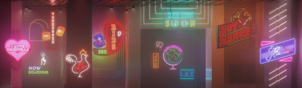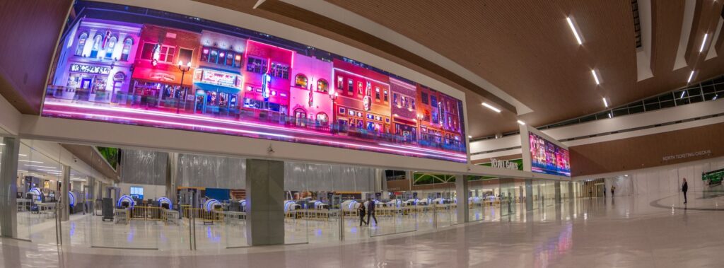 In the security zone, passengers will be greeted by two adjacent displays portraying cultural staples belonging to the city and its surrounding region. Spanning two panoramic screens each 70ft wide at 24K combined resolution, hours of video capsules have been curated to pay homage to Nashville’s legacy. With the mantra ‘good times await your return’, the team produced hours of original video content including advanced computer-generated imagery (CGI) and live-action filmmaking captured in over 20 locations within Nashville and surrounding Tennessee areas.