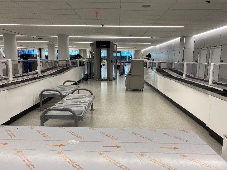 - Individual, side-by-side, stainless-steel stations that enable four travelers to place their carry-on property in bins; all carry-on property must be placed in a bin;