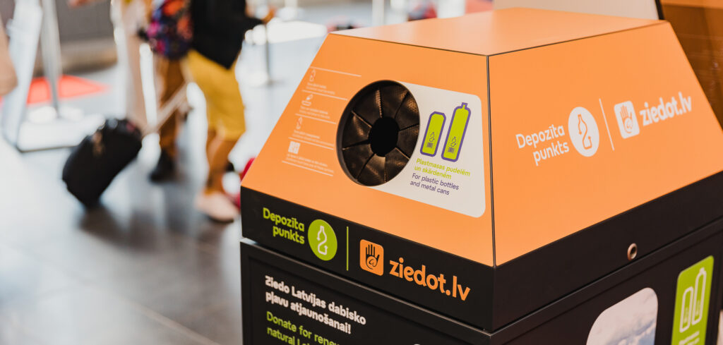 Santa Auguste–Šole, head of the airport’s sustainability and environmental management unit of quality and sustainability department, said, “We are delighted together with our cooperation partners to take one step closer to cleaner environment and more sustainable development, facilitating implementation of principles of circular economy in the daily life of our passengers. The airport has set a goal to increase the proportion of sorted waste up to 66 % of the total volume of waste and not only our employees, tenants and cooperation partners can help us achieve this goal – passengers can also help us. The donation point for deposit packaging in the preparation zone before the flight where passengers often need to get rid of their water bottles and other packaging is a double gain: the packaging is given for second use and the deposit is donated to the Latvian Fund for Nature to retain biological diversity and restoration of endangered meadows.”