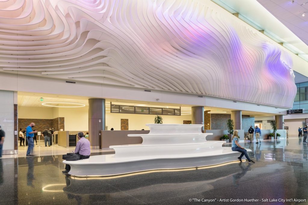 Art in transit centers, museums, universities and public plazas is for everyone, not just the artist, so it is important to have clear objectives. For the new Salt Lake City International Airport, the mission from the start was to celebrate the natural beauty of Utah in a fully architecturally integrated art program, for which we created The Canyon, The Falls, The River Tunnel, The Column Plates and Benches, and more. These works help market the incredible scenery and parks of Utah to millions of passengers.